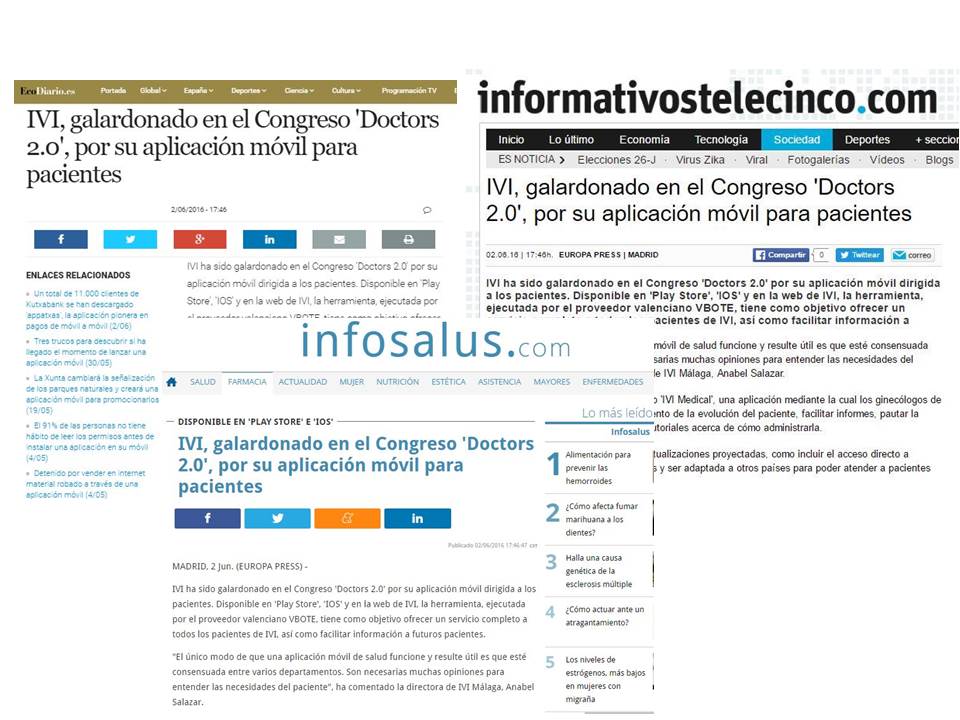 • El portal del paciente o APP de IVI, desarrollado por VBOTE, ha sido premiado bajo el marco del Congreso Internacional de Salud Digital, Doctors 2.0, por crear un canal de comunicación directo entre médicos y pacientes