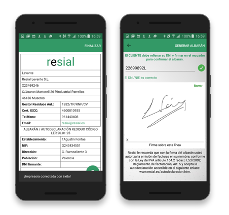 Una vez firmado en el dispositivo por el proveedor confirmando la cantidad recogida, la aplicación convierte el albarán en archivo PDF y lo envía al sistema de gestión junto a otros datos como el conductor, hora y localización de la entrega. El albarán firmado se entrega impreso al proveedor gracias a la impresora portátil conectada por bluetooth con la app de albaranes de Resial.