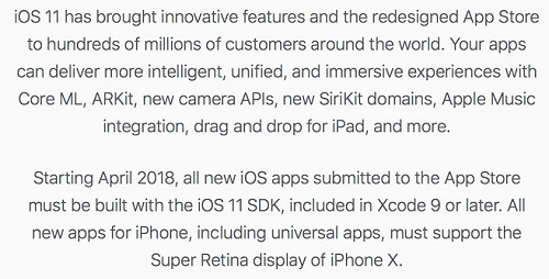 Exigir la compilación con SDK de iOS11 no significa necesariamente que las aplicaciones deben admitir nuevas funcionalidades. Asegura que los nuevos desarrolladores de aplicaciones utilicen las últimas herramientas de desarrollo de Apple, para evitar que la App Store en general se vuelva obsoleta.