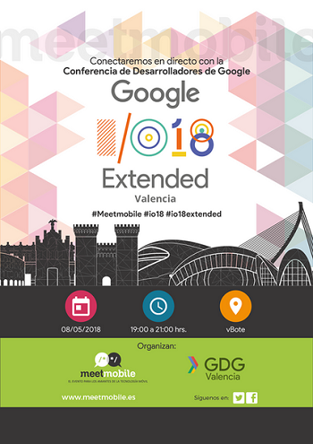 MEETMOBILE, el evento para los amantes de la tecnología móvil y GDG Valencia (Google Developers Group) organizan su próximo meetup el 8 de mayo de 2018. Será la versión local Google I/O Extended 2018 Valencia y en él asistiremos a la keynote que da inicio al congreso Google I/O del gigante de la tecnología de Mountain View, California.