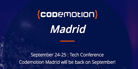 Codemotion es una conferencia técnica de dos días dedicada a todos los lenguajes y tecnologías como Arquitectura de Software, Cloud/Serverless, Big Data, DevOps, Cybersecurity, Blockchain, IoT, AI/Machine Learning, Motivadoras/Inspiracionales, Diversidad en el ámbito tecnológico, Front-End, Diseño/UX, AR/MR/VR, Desarrollo de juegos.