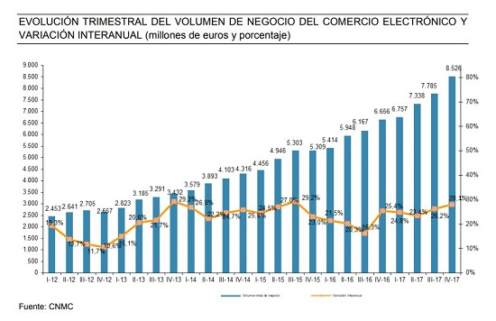 La facturación del comercio electrónico en España creció en el cuarto trimestre de 2017 un 28,1% interanual hasta alcanzar los 8.526 millones de euros, según los últimos datos de comercio electrónico disponibles en el portal CNMCData.
