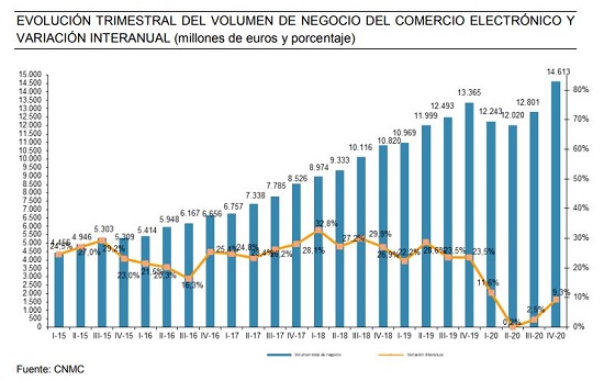 La facturación del comercio electrónico en España aumentó en el cuarto trimestre de 2020 un 9,3% interanual hasta alcanzar los 14.613 millones de euros, según los últimos datos de comercio electrónico disponibles en CNMCData. En el conjunto del año 2020, superó los 51.600 millones de euros, un 5,8% más que el año anterior
