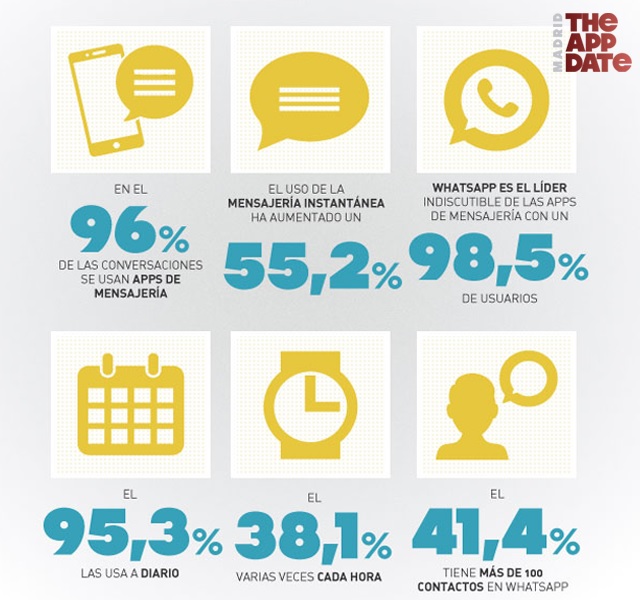 Según otro informe realizado por The App Date, la mayoría de la muestra encuestada prefiere comunicarse a través de aplicaciones de mensajería que por llamadas de voz u otros mecanismos; pero aparte el uso de estas apps en nuestro día a día es muy elevado, siendo el 95,3% que las usa a diario, y el 38,1% que las consulta una o varias veces por hora.