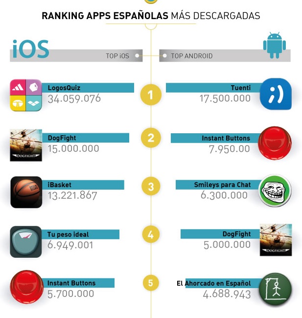 Las apps españolas más descargadas este pasado año han sido las siguientes: Tuenti, LogoQuiz, Instant Buttons, DogFight, iBasket, Smileys para Chat, y El ahorcado. Todas ellas dentro de las categorías de comunicación y entretenimiento.