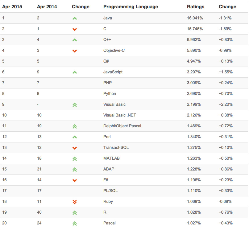 Hoy ofrecemos esta referencia para comprobar cómo de actualizados están nuestros conocimientos. Tanto en cuanto a lenguajes de programación que usamos, como a la hora de decidir cuál aprender o adoptar. Y con esta tabla vemos la evolución anual entre abril 2014 y abril 2015. ¡Hay cambios en las primeras posiciones!