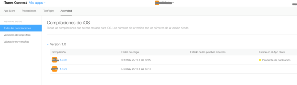 4. Haz clic en la pestaña Actividad para mostrar las compilaciones que se han subido con la herramienta Application Loader para enviar a revisión.