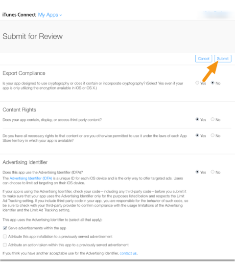 8. Haz clic en "Enviar para revisión" y responder a las preguntas finales de Apple sobre tu aplicación y, a continuación, haga clic en "Enviar".