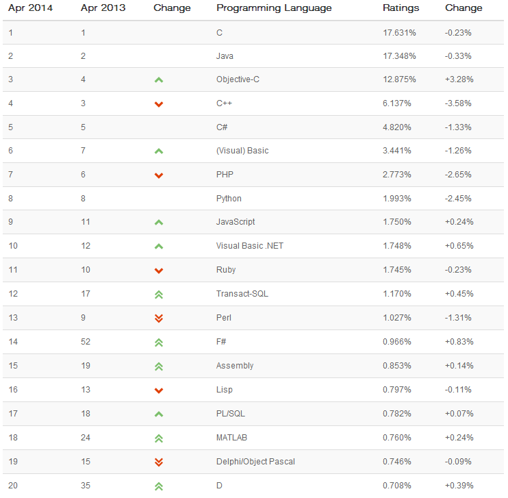 Ranking de lenguajes de programación más usados para 2014