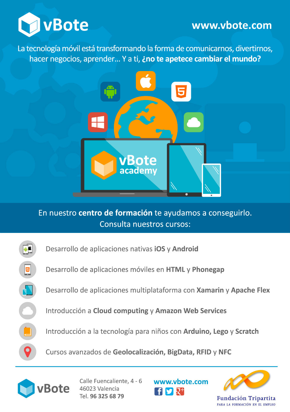 La tecnología móvil está transformando la manera de comunicarnos, divertirnos, hacer negocios, aprender... En el centro de formación vBote queremos que estés al día en las nuevas tecnologías y por eso ampliamos nuestro catálogo formativo, para ofrecerte los conocimientos más actuales y poder marcar la diferencia en tu trabajo.