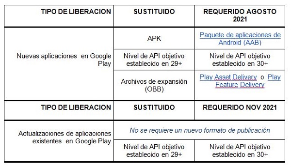 En 2021 Google continúa actualizando el nivel de API objetivo, por lo que las nuevas aplicaciones en Google Play deben apuntar al nivel de API 30 (Android 11) en agosto 2021. Y en noviembre 2021 será necesario para todas las actualizaciones de aplicaciones ya existentes en Google Play.