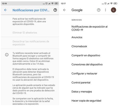 Es posible comprobar si nuestro Smartphone ya tiene disponible el servicio que en el caso de Android nos ha actualizado de manera transparente. En Ajustes / Google junto a nuestra cuenta de Google aparecen los servicios disponibles, y el primero puede ser “Notificaciones de exposición al COVID-19”