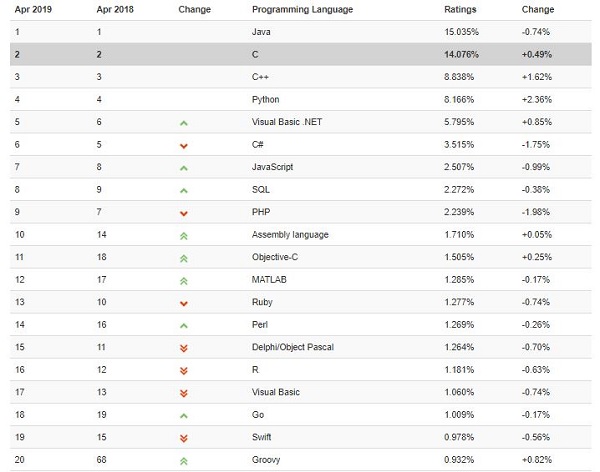 Ofrecemos esta referencia para comprobar cómo de actualizados están nuestros conocimientos. Tanto en cuanto a lenguajes de programación que usamos, como a la hora de decidir cuál aprender o adoptar. Y con esta tabla vemos la evolución anual entre abril 2018 y 2019.