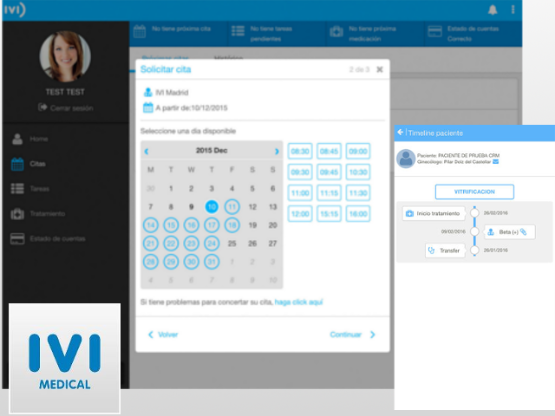 En la sección Mis pacientes IVI, el médico tiene acceso a la historia clínica y los datos de la primera cita, tratamiento, embarazo y pruebas, etc... Por ejemplo: